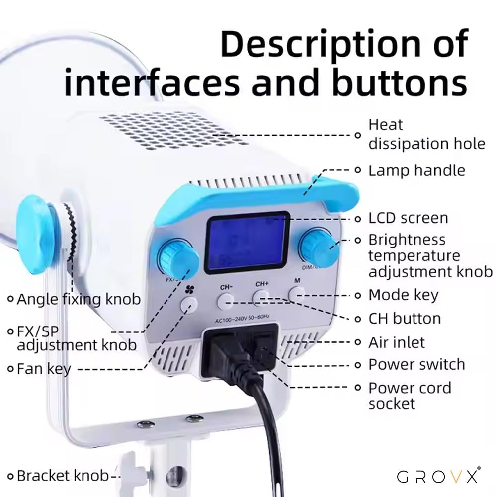 • ارتقِ بجودة أعمالك مع إضاءة GROVX الاحترافية بقوة 320 واط ، المصممة خصيصاً لتلبية احتياجات المصورين وصناع المحتوى كا التصوير عبر تيك توك او الانستقرام او سناب شات بتصوير الاعلانات . توفر هذه الإضاءة تحكمًا كاملاً في درجة اللون
